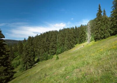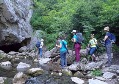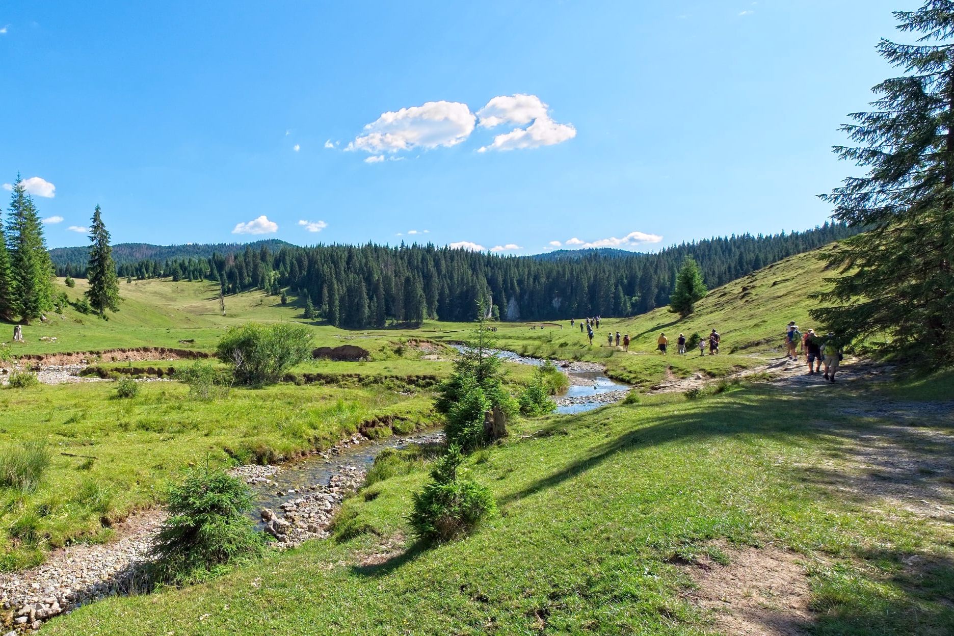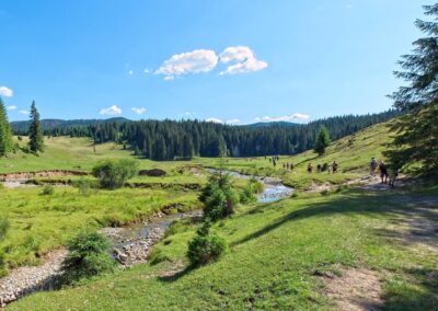 Rövid szünet után egy ritkán használt, keskeny ösvényen ereszkedünk le és a katlan oldalában haladunk a Ponor réti elágazásig, majd meredek leejtőn leereszkedünk a Ponor vízkelethez. Innen végighaladunk a Ponor réten a víznyelőkig, ahonnan rövid fotószünet után felkapaszkodunk a vízválasztó gerincre. A gerincről leereszkedünk a Glavoj rétre, ahol uzsonnaszünetet tartunk.